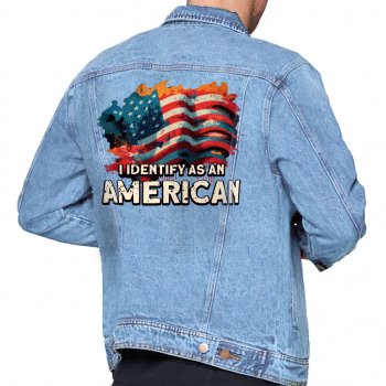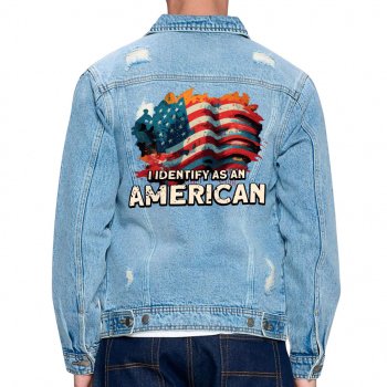 I Identify As American Light Washed Men’s Denim Jacket – USA Flag Denim Jacket – Patriotic Jacket for Men