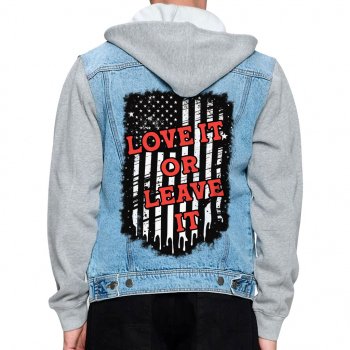 Love It Or Leave It Men’s Denim Jacket – American Patriot Jacket With Fleece Hoodie – Quote Design Jacket for Men