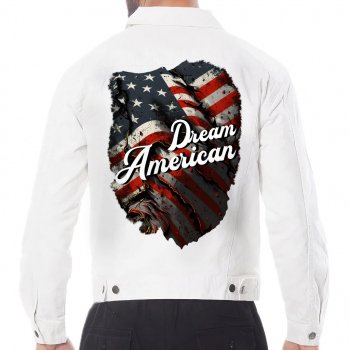 Dream American Men’s White Denim Jacket – Patriotic Denim Jacket for Men – USA Flag Denim Jacket
