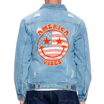 Patriotic Vibes Men’s Distressed Denim Jacket – American Flag Denim Jacket for Men – Quotes Printed Denim Jacket