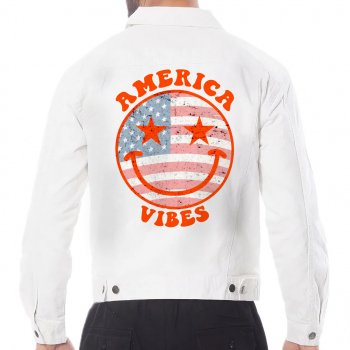 America Vibes Men’s White Denim Jacket – American Flag Denim Jacket for Men – Quotes Denim Jacket