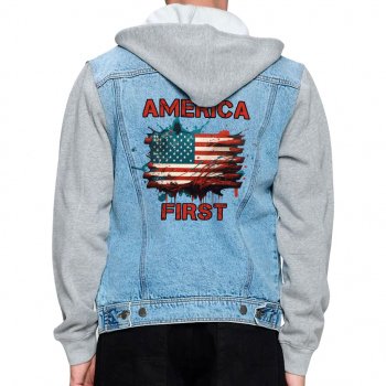 America First Men’s Denim Jacket – United States Jacket With Fleece Hoodie – USA Patriot Jacket for Men