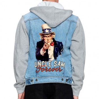 Uncle Sam Men’s Denim Jacket – USA Themed Jacket With Fleece Hoodie – Art Print Jacket for Men