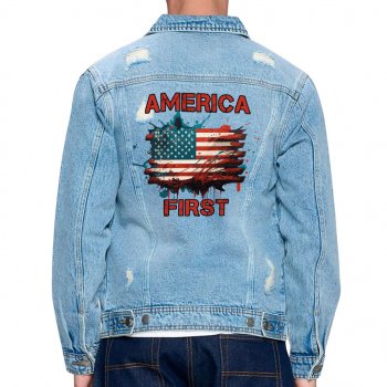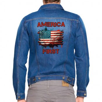 America First Men’s Distressed Denim Jacket – United States Denim Jacket for Men – USA Patriot Denim Jacket