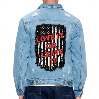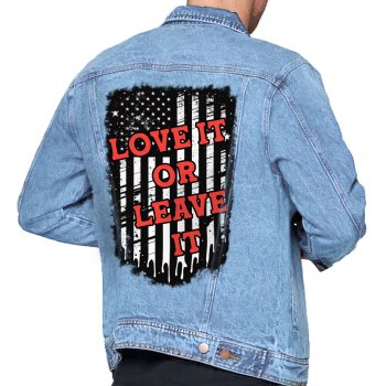 Love It Or Leave It Men’s Distressed Denim Jacket – American Patriot Denim Jacket for Men – Quote Design Denim Jacket