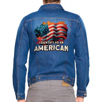 I Identify As American Men’s Distressed Denim Jacket – USA Flag Denim Jacket for Men – Patriotic Denim Jacket