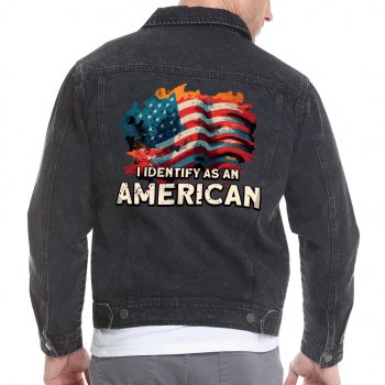 I Identify As American Men’s White Denim Jacket – USA Flag Denim Jacket for Men – Patriotic Denim Jacket