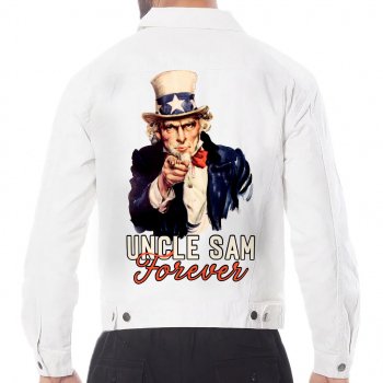 Uncle Sam Men’s Distressed Denim Jacket – USA Themed Denim Jacket for Men – Art Print Denim Jacket