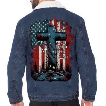 Patriotic Vibes Men’s Sherpa-Lined Denim Jacket – American Flag Denim Jacket – Quotes Printed Jacket for Men