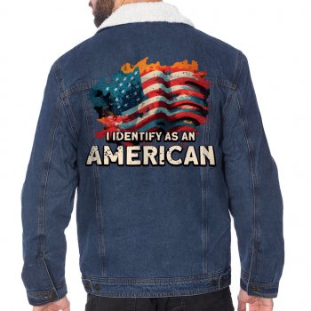 I Identify As American Men’s Sherpa-Lined Denim Jacket – USA Flag Denim Jacket – Patriotic Jacket for Men